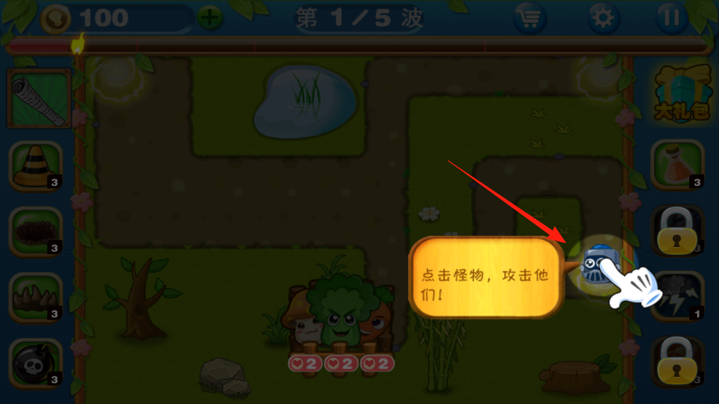 2、进入战斗场景,看到有怪物出现,按照提示点击怪物,发动攻击,每次点击都能给怪物造成伤害,多点击几次,把怪物消灭,保护好蔬菜,别让它们被怪物吃掉,顺利通过这一波。