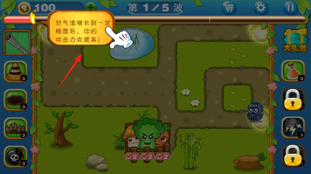 3、注意上方怒气值提示,攻击怪物时怒气会增长,等怒气值到一定程度,攻击力会提高,这时候打怪物更轻松,瞅准时机全力输出,快速清怪,让蔬菜防线更稳,通关更顺利。