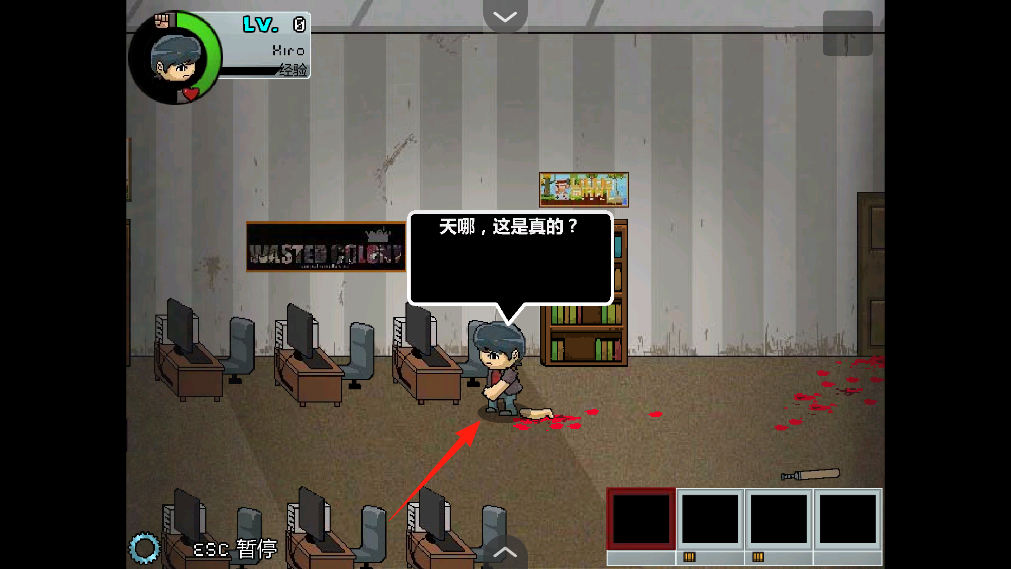 3、进入游戏场景,操控主角Hiro在房间里移动,遇到对话气泡先读内容,注意收集房间里的物品,像地上的血迹周围的道具,可能和解谜战斗有关,慢慢探索,解锁新区域新剧情。