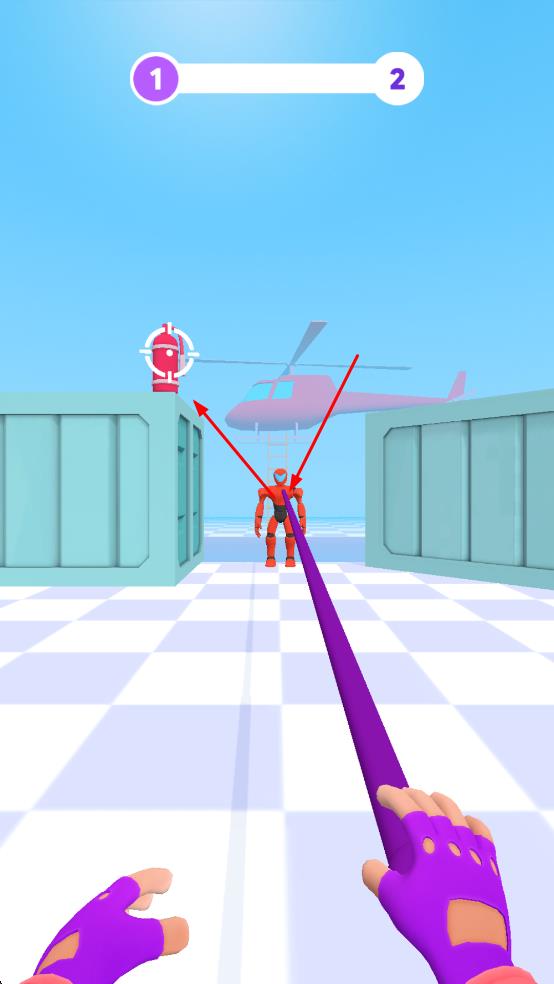 1、进入关卡界面后,瞄准红色机器人或目标物体发射绳索,这是开启挑战的关键操作,确保精准命中推进进程。