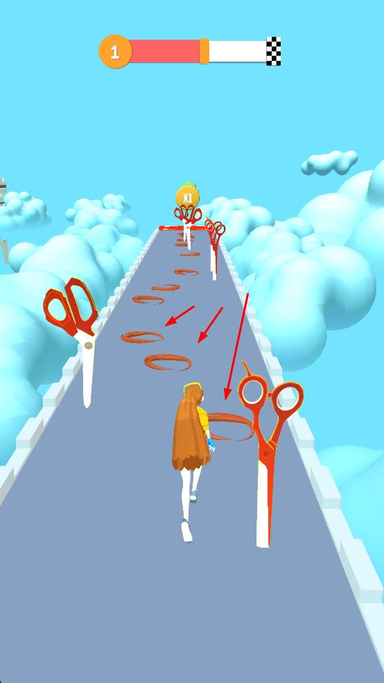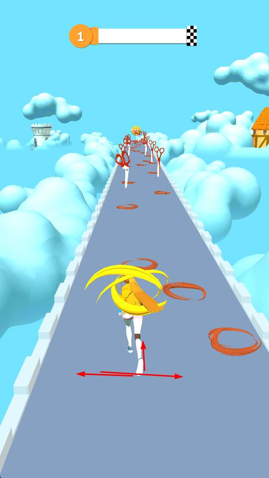 2、在移动过程中,躲避道路上的剪刀障碍,同时收集散落的头发道具。