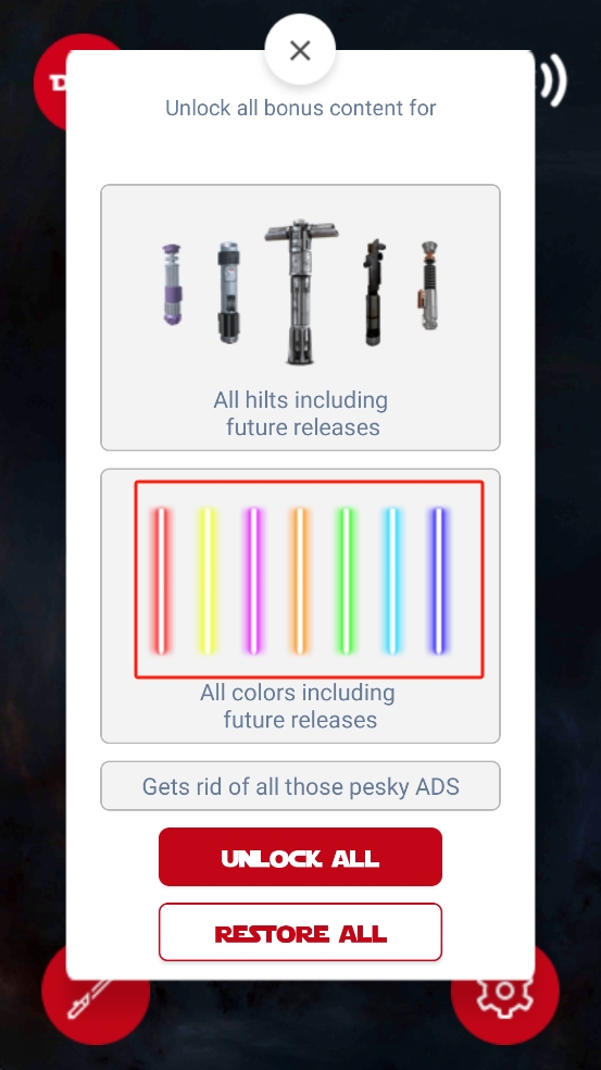 3、若想获取所有光剑剑柄、颜色等奖励,可点击UNLOCK ALL按钮解锁,若之前购买过,点RESTORE ALL恢复即可。