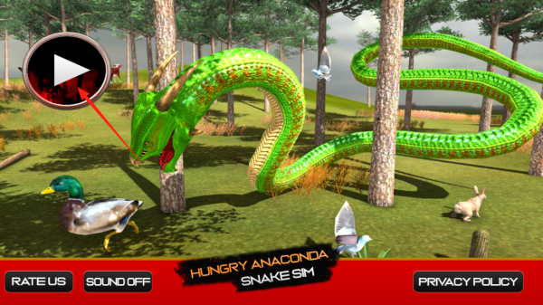1、进入游戏主界面,看到绿色大蛇和周围小动物,点左上角带播放图标的按钮,开启游戏,操控大蛇在森林里捕食,体验当饥饿巨蟒的感觉,追捕鸭子兔子这些猎物。