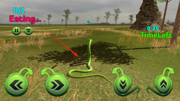 3、屏幕显示0/1,要在25秒内让大蛇吃1个猎物,用下方绿色方向按钮,控制大蛇移动,找鸭子小鸟这些目标,碰到猎物就吃掉,完成任务,要是超时或没吃到,可能就得重新来。