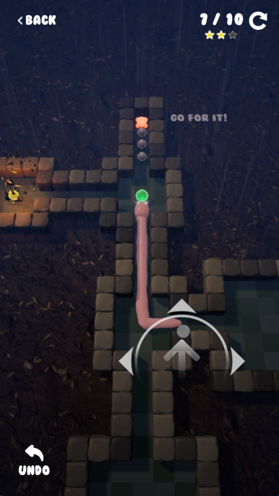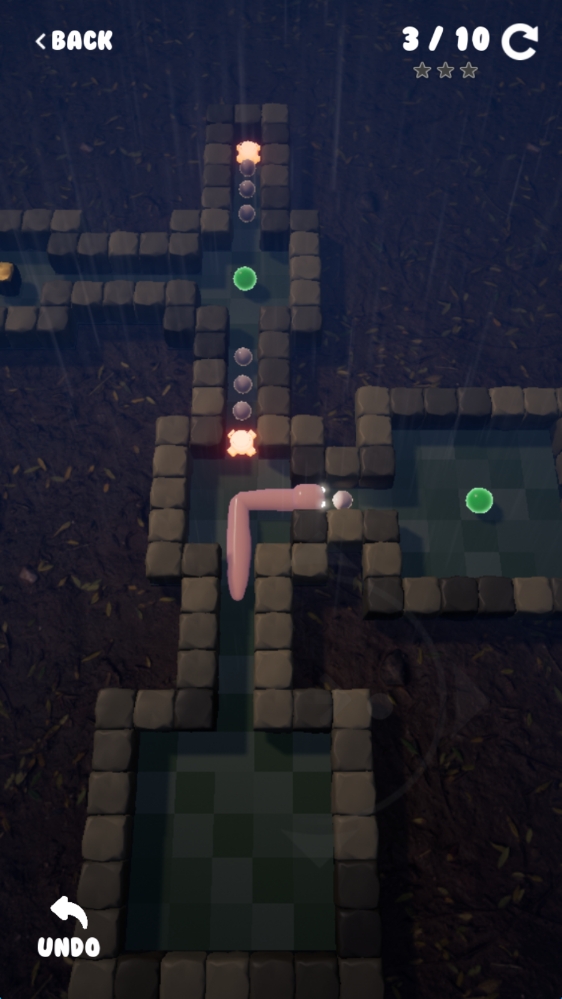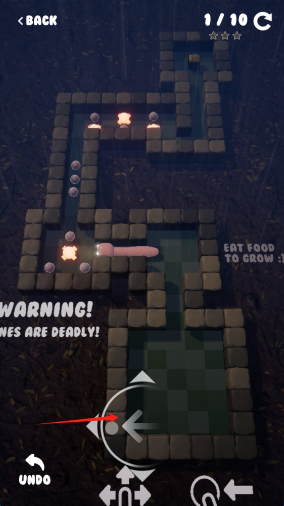 2、关卡界面,操控粉色虫子,在迷宫中收集食物,躲避危险,完成关卡目标,拨动轮盘移动。