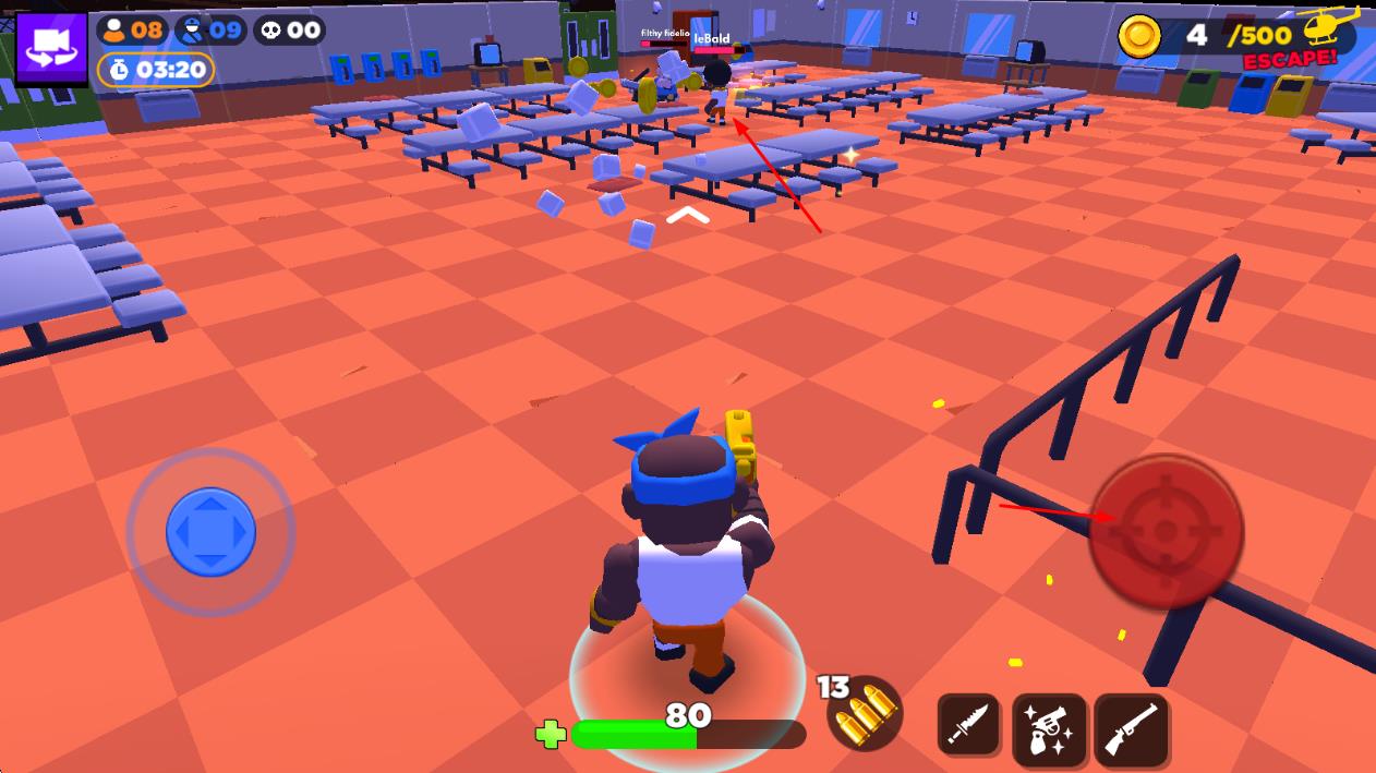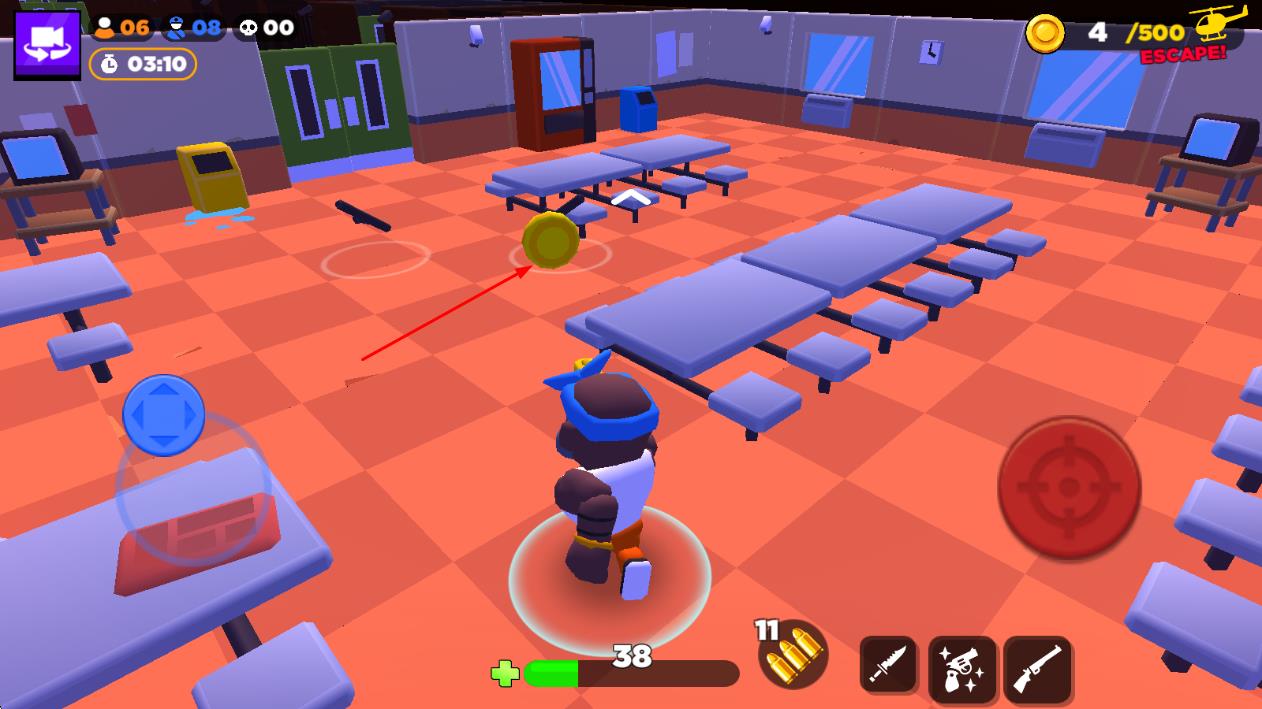 2、在监狱内移动时摧毁桌椅、木箱等物品获取金币,用金币在补给点兑换武器、弹药或逃脱工具,应对敌人攻击。
