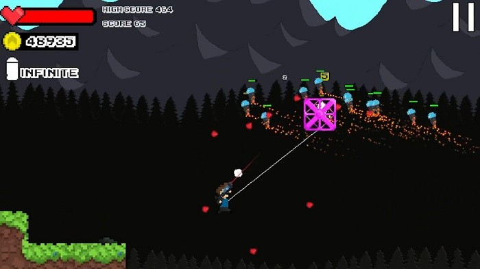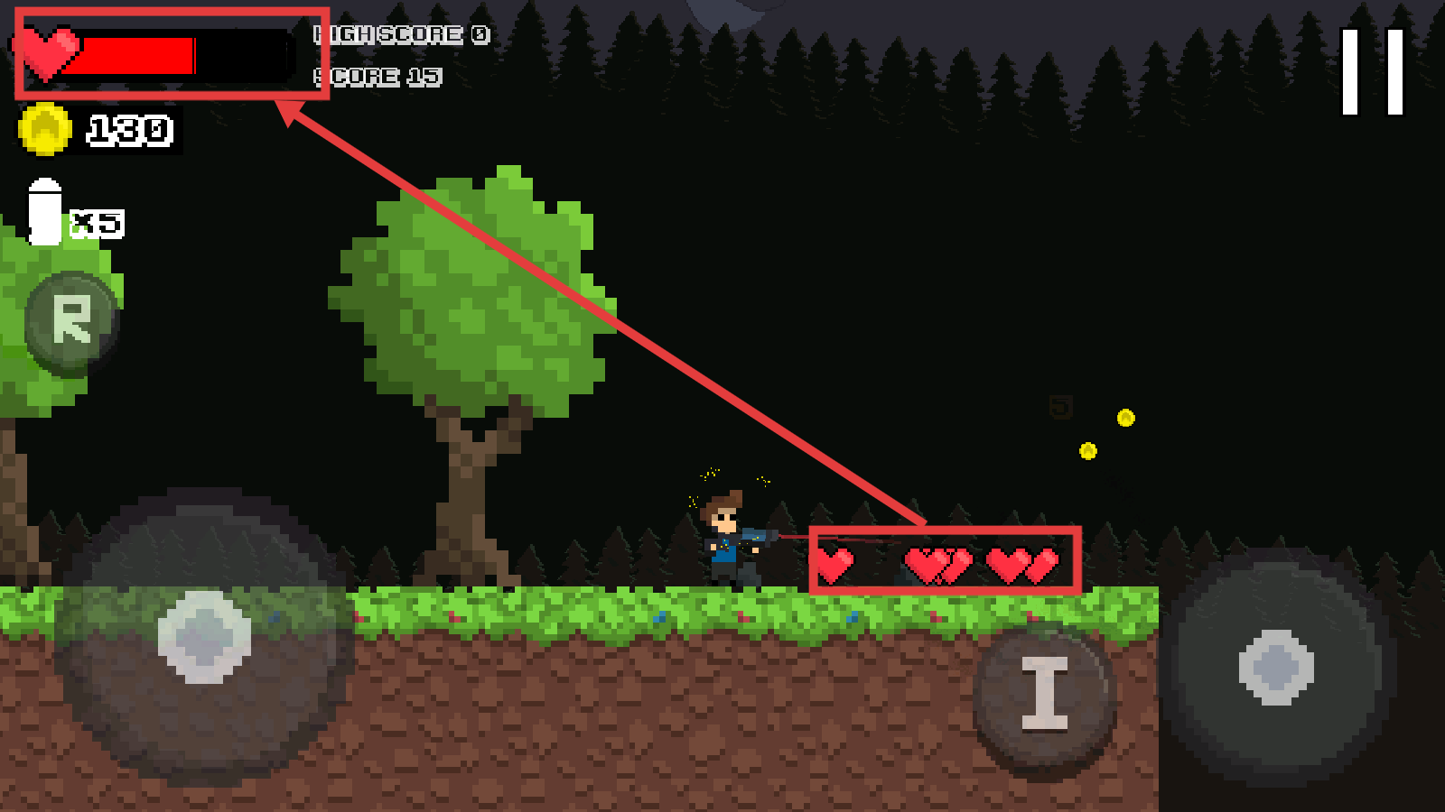 3、优先收集地面【红色心形道具】,补充左上角血量条,提升生存续航能力,应对敌人攻击。