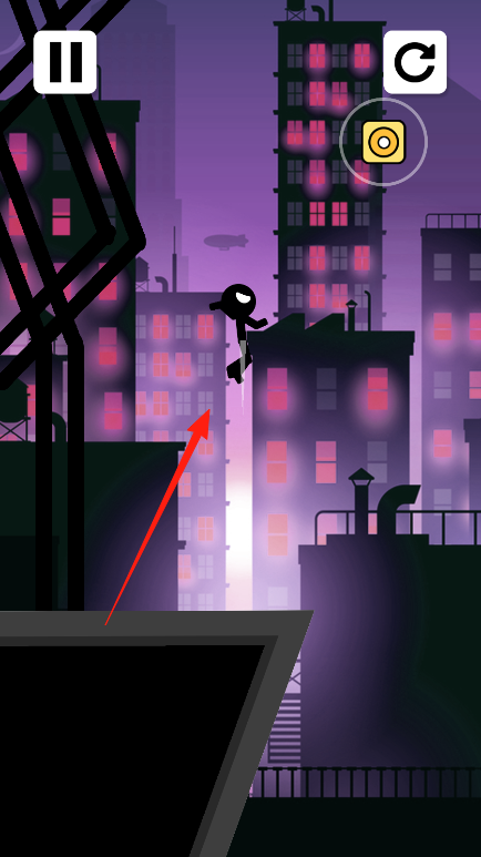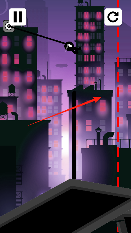 3、按箭头指引方向,发射绳索至建筑,完成荡跳、攀爬,持续推进关卡,躲避危险。