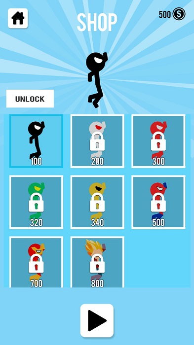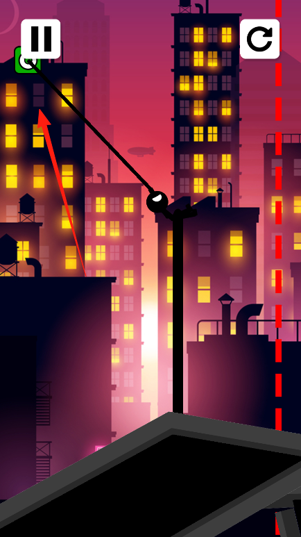 1、进入游戏界面,操控火柴人,利用绳索类似蜘蛛丝,点击屏幕发射,附着建筑攀爬、荡跃。