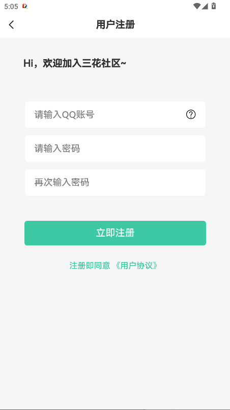 1、hi,欢迎加入三花社区,输入QQ帐号以及其他的数据,就可以进行账户的注册了。