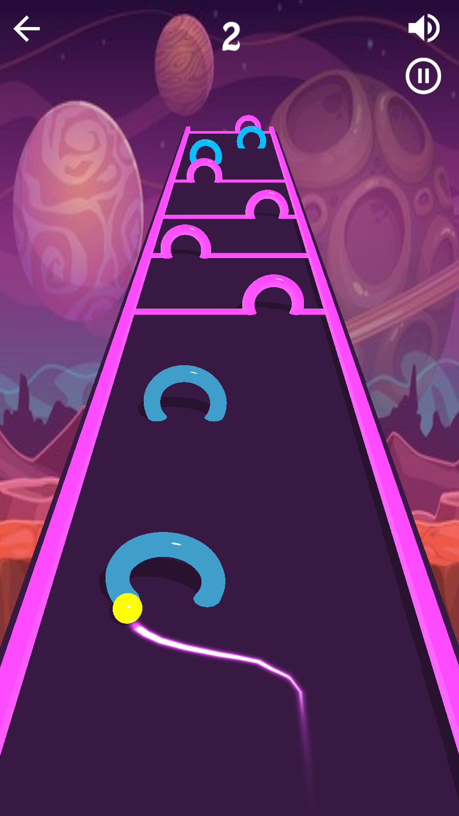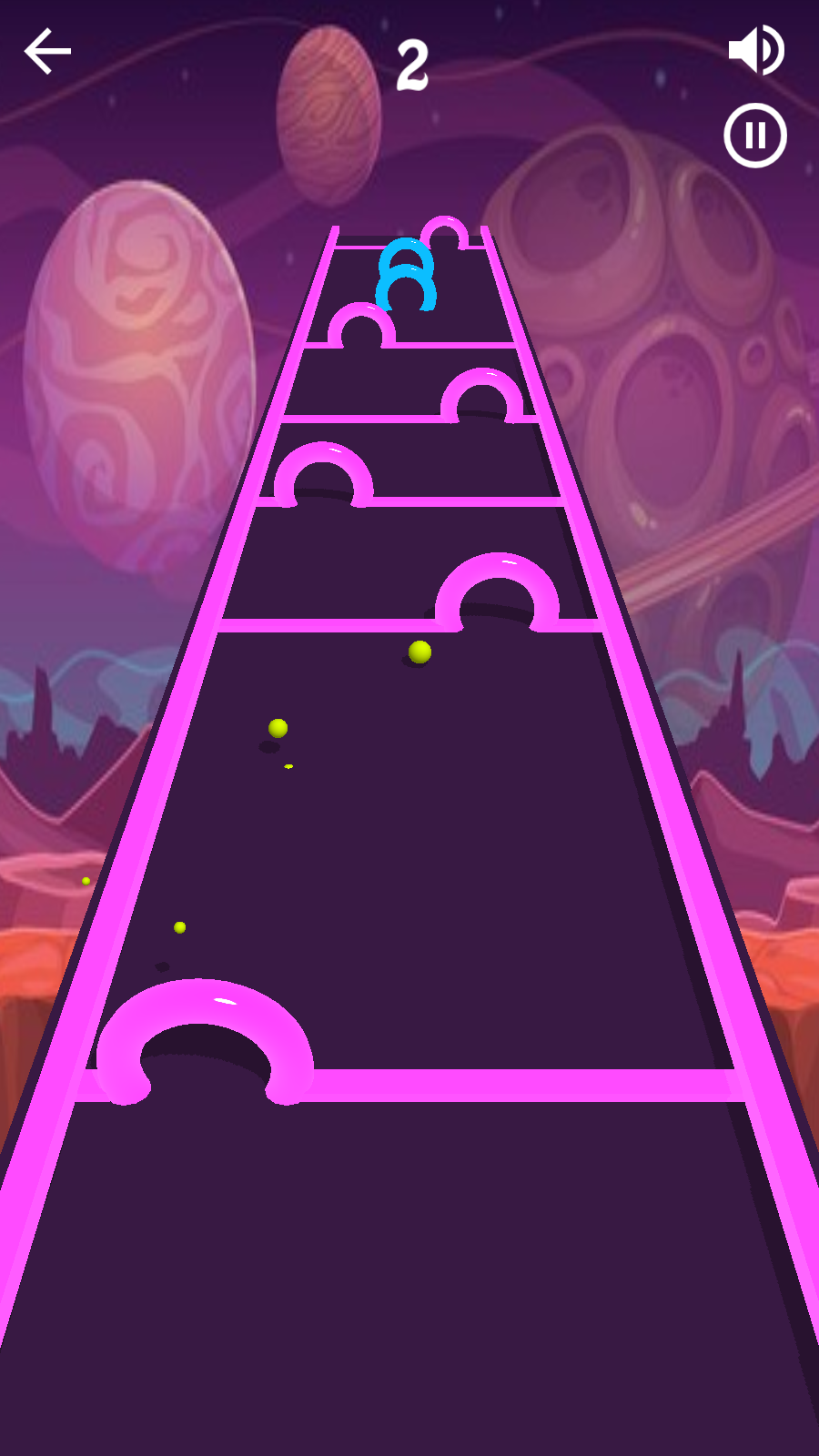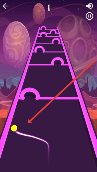 2、游戏中滑动屏幕控制黄色小球移动,沿粉色跑道前进,躲避障碍,尽可能跑得更远以提升分数。