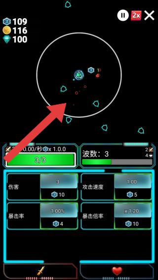 2、进入到游戏场景内,显示总波数为3,玩家需要攻击3波敌人,可观察伤害、攻击速度以及暴击率。