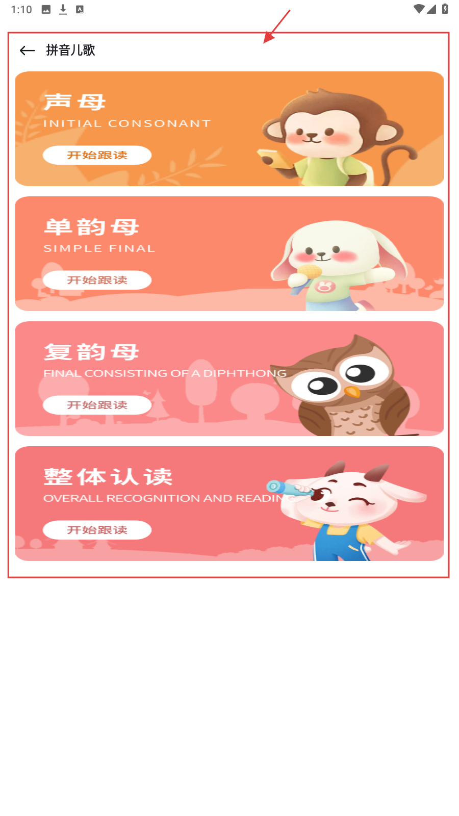 2、在【拼音儿歌】页,按需选【声母】【单韵母】等分类,开始跟读练习。