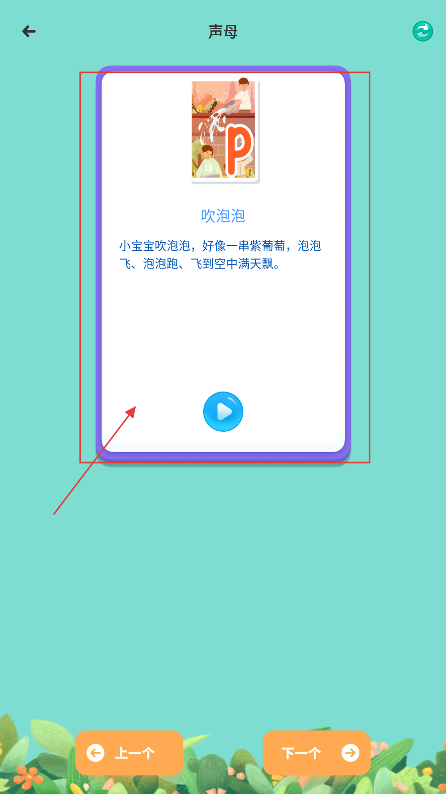 4、学习声母“p”时,看图文、听发音,借助【上一个】【下一个】学更多声母。