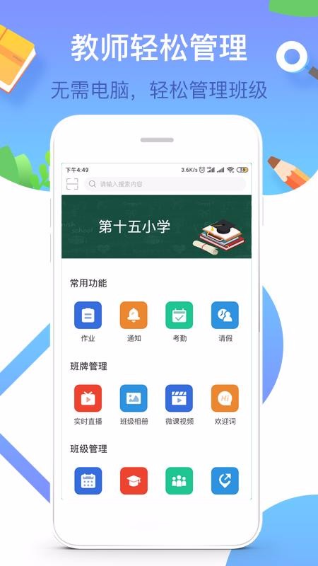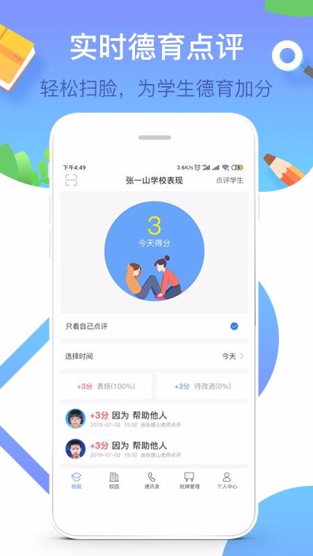 3、开设多种管理中心,主功能栏里面设置了班级、校园、通讯录以及班级管理中心支持你学习。