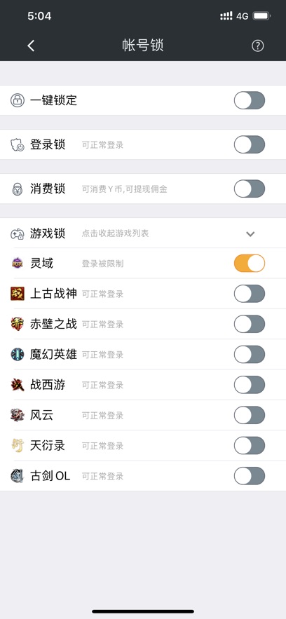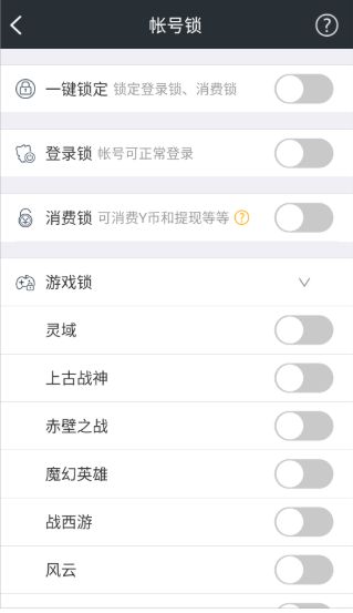 3.点击【账号锁】功能,你可以根据需求开启登录锁、消费锁、游戏锁等多种账号保护措施;