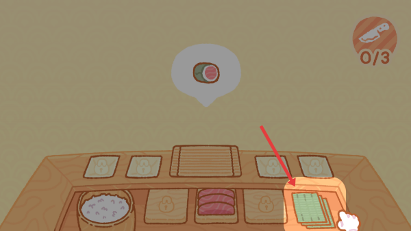 2、进入寿司制作界面,依据提示点击绿色海苔食材,将其放置到操作台指定位置,作为制作寿司的基础材料。
