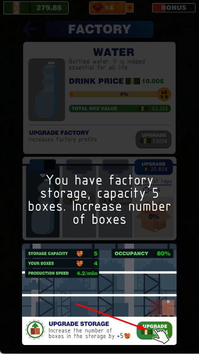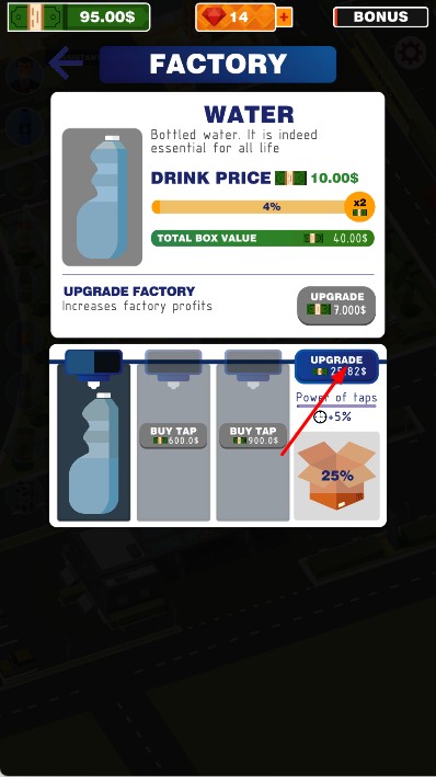 2、工厂建成后,进入工厂界面,可看到饮品售价,每箱价值,点击UPGRADE按钮,升级水龙头功率,花费资金提升生产效率、存储能力,增加工厂收益。