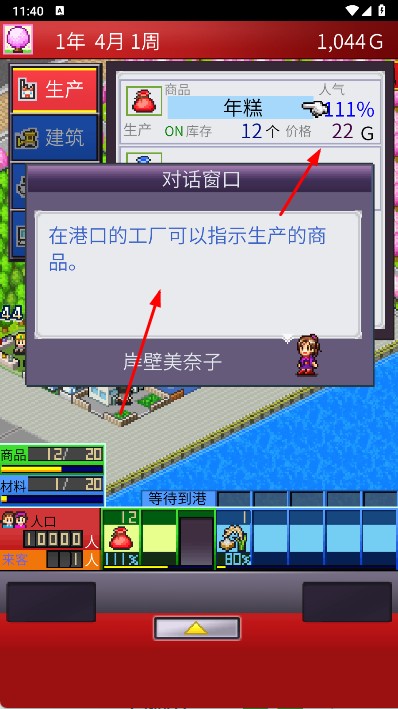 2、在生产界面,选择商品,点击生产,将商品录入空槽,通过建筑拓展港口设施,港湾调度货物运输,系统管理运营。
