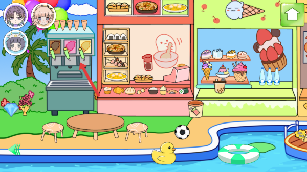2、在店铺区域,探索各类的餐食店如甜品店、简餐店等,点击店内食物、设备,触发制作、摆放等互动。