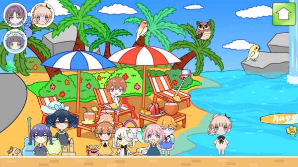3、前往海滩场景,操控角色与人物、动物鹦鹉、猫头鹰互动,点击躺椅、遮阳伞等道具,安排角色休息。