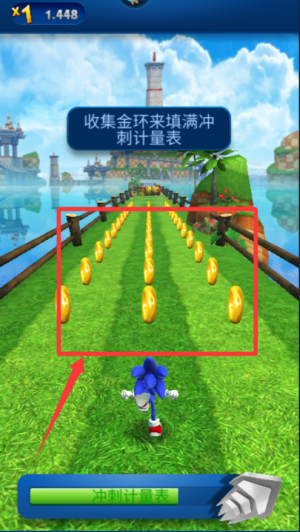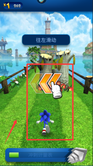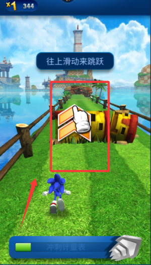 1、进入游戏后索尼克会自动向前奔跑,用手指左右滑动屏幕切换跑道,注意避开障碍物和敌人,保持速度前进。