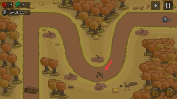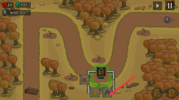 1、点击带锁的建筑旁蓝色旗帜的图标,消耗部分的资源部署防御单位到路径,构建初始的防线。