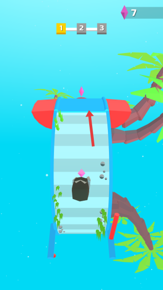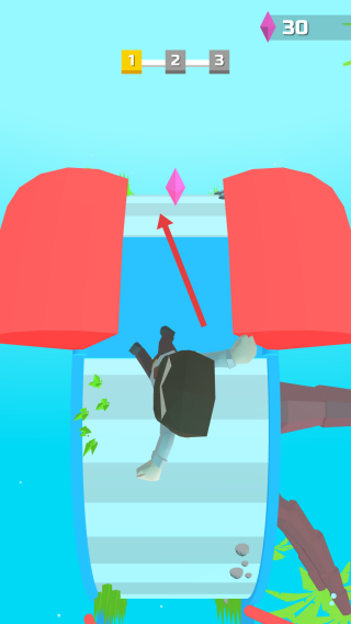 1、向上滑动角色开始前行,遇红色旋转的障碍,左右滑动屏幕,让角色避开,继续收集粉色菱形。