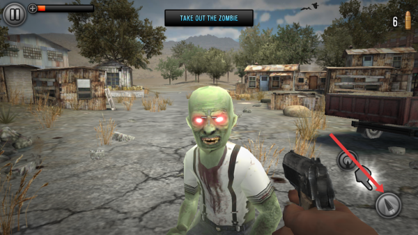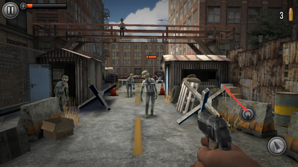 1、瞄准近距离僵尸如第一关绿色的僵尸,点击屏幕的射击按钮,精准击中僵尸头部,快速的消灭目标。