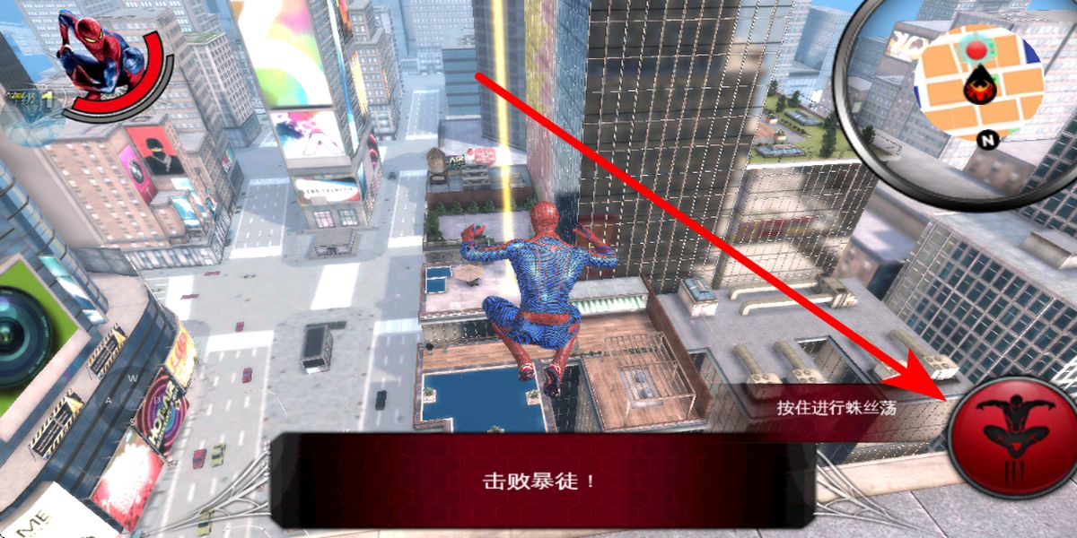 2、城市高空场景中,界面右侧有按住进行蛛丝荡,按住该按钮,蜘蛛侠会射出蛛丝,借助建筑进行蛛丝荡移行,快速穿梭于城市间执行任务。