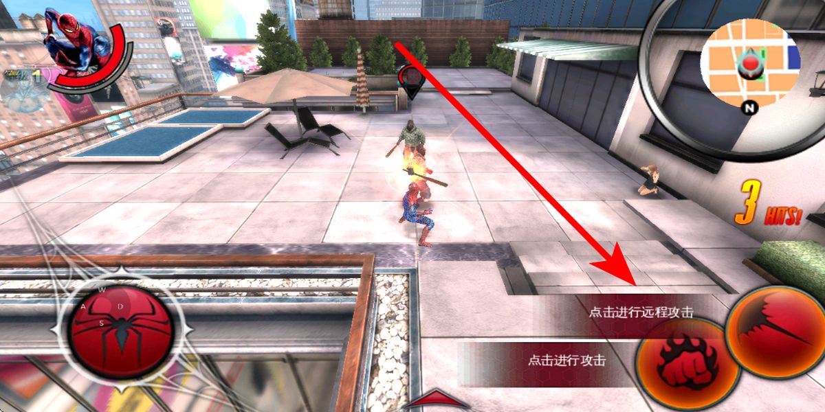 3、遭遇敌人时,界面右侧出现点击进行远程攻击,点击此按钮,蜘蛛侠可释放远程攻击手段,战斗中先制敌,配合近战攻击能更高效击败敌人。