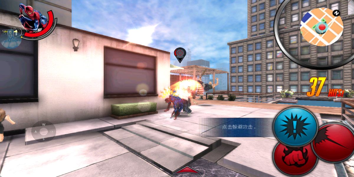 1、触屏操作:采用触屏按钮式操作,配合连续按压可使出连击及组合技能,通过近攻远攻躲避等方式对抗敌人,展现蜘蛛侠的战斗能力。
