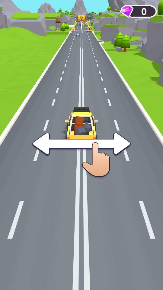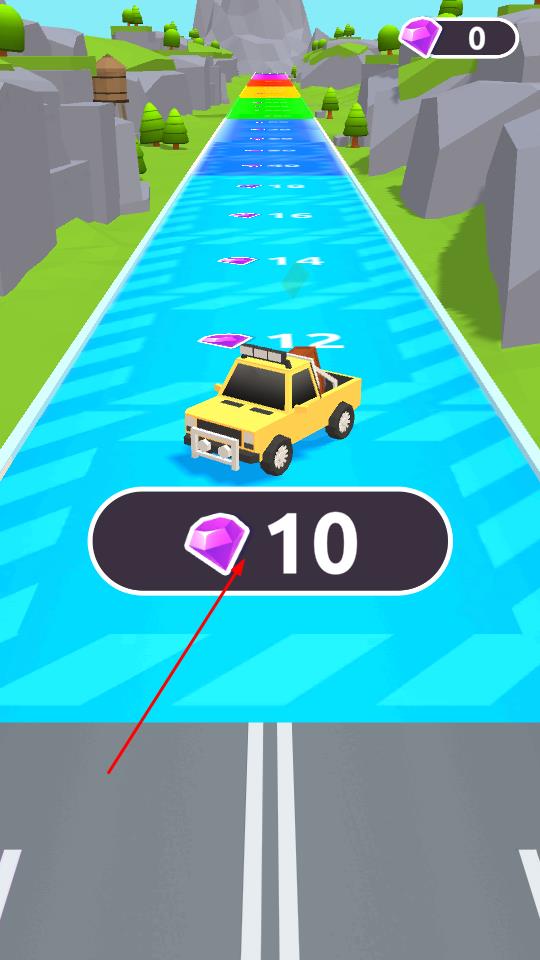 3、行驶过程中收集道路上的紫色钻石,积累资源用于升级车辆或解锁新道具,朝着终点持续推进,突破关卡挑战。
