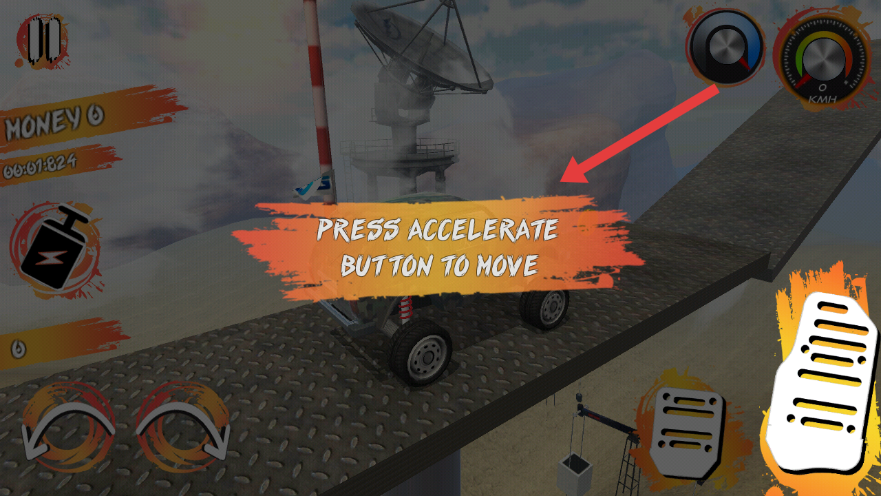 1、进入游戏后,按提示按下加速键启动车辆,点击右侧加速按钮,驱动越野车开始行驶。