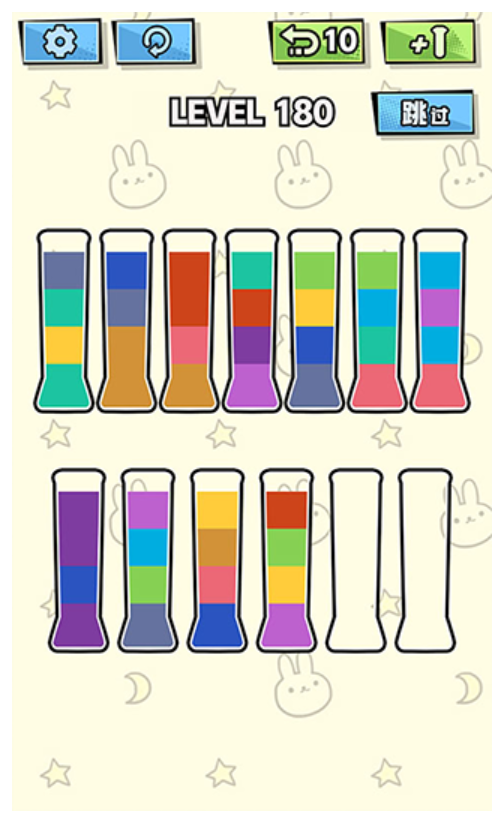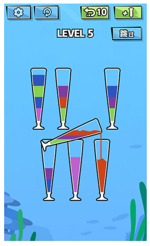 3、遇到复杂关卡别乱倒,先想好几步的路径,比如先把杂色移到中间杯暂存,一步步把同色液体归到同一个杯子里。