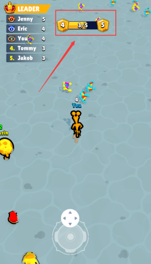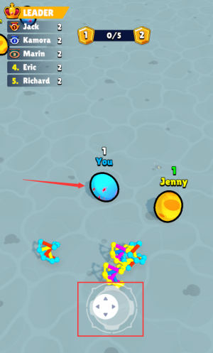 2、使用红框虚拟摇杆,操控蓝色角色移动方向。