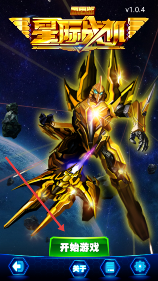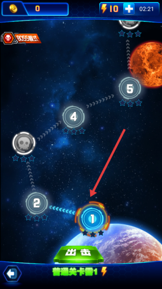 2、在关卡地图,选定标有1的首关,点击出击,驾驶战机进入战斗场景,直面宇宙敌人与障碍。