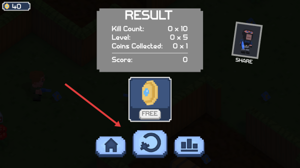 3、失败后点主页按钮回主界面,用战斗金币升级武器、角色属性,重开游戏,优化射击、走位策略,冲高分。