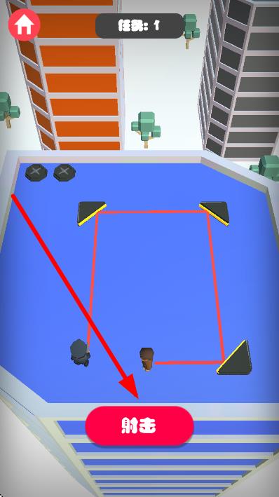 3、确认光线经反射道具形成闭合路径后,点击下方射击按钮,发射子弹,利用反射击中目标完成任务。