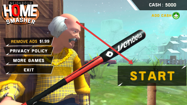 1、在Neighbour-Home-Smasher主界面,点击右侧START按钮,以5000现金开启游戏,进入武器选择环节,准备挑选战斗道具。