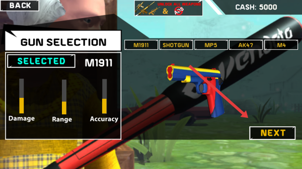 2、武器选择界面选定M1911手枪,查看其伤害、射程与精准度属性后,点击NEXT按钮,进入关卡选择界面规划挑战。