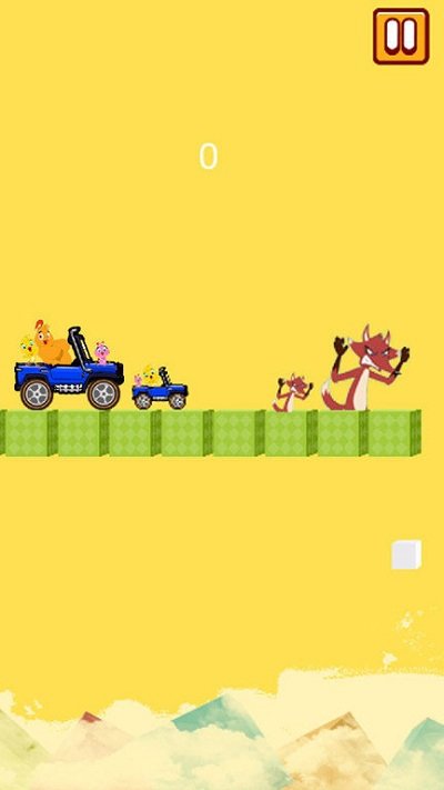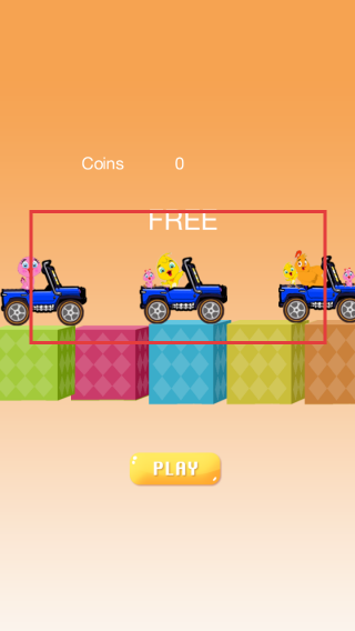 1、进入游戏主界面,点击PLAY按钮,开启趣味冒险,操控载有小鸡等角色的车辆,在彩色方块场景前行。