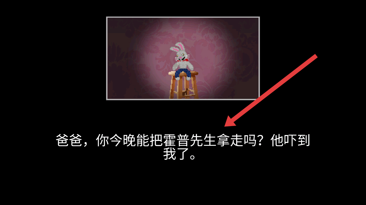 1、进入游戏的开场剧情中,孩子提及霍普先生兔子玩偶兔子吓人,需要留意后续对该玩偶的剧情。