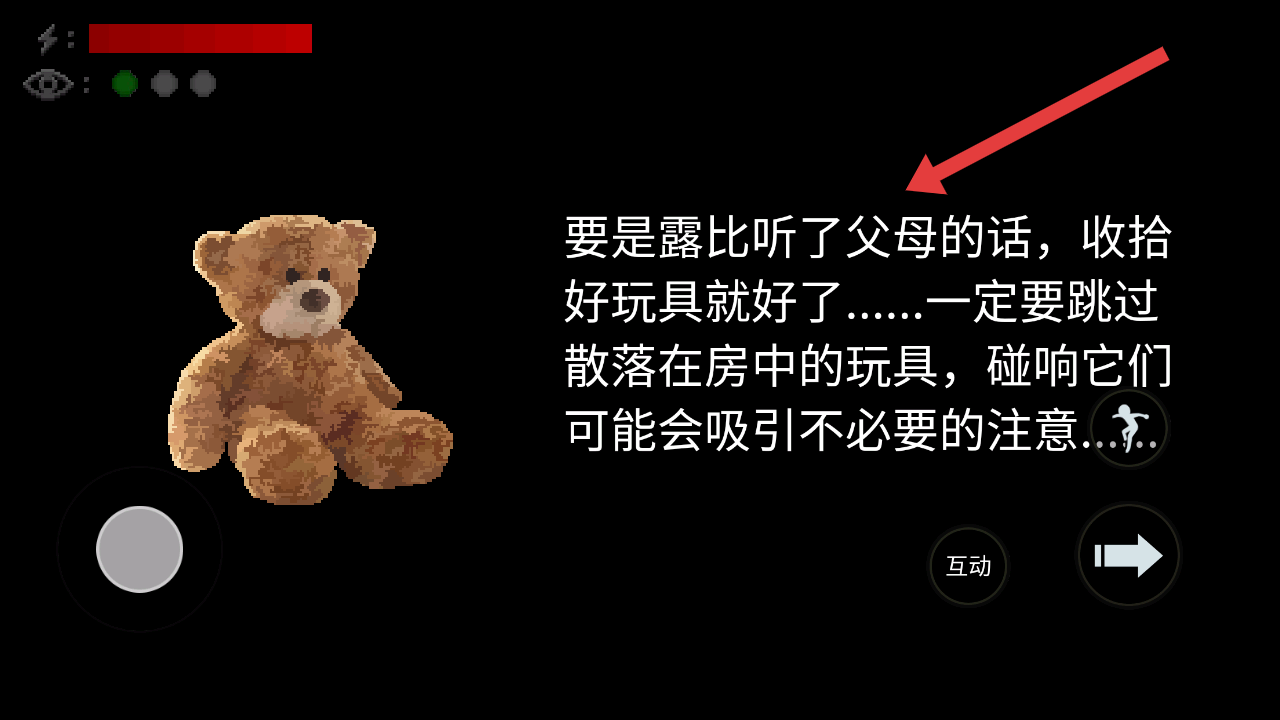 2、当在自己的房间里遇到泰迪熊等散落玩具时,按提示操控角色进行跳过,避免碰响引发危险。