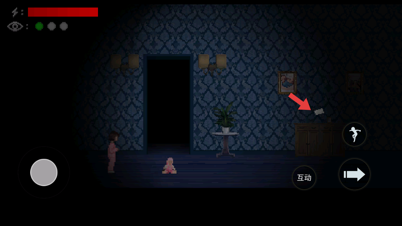 3、在另外的房间场景,看见前方的玩偶点击跳跃的按钮,避开触发噪音的玩偶,拾取前方的白色小纸条。