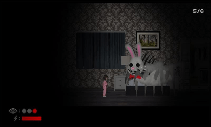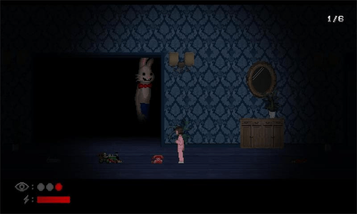 2、场景叙事隐线:场景细节暗藏叙事隐线,床上的血迹暗示过往事件,直立行走的兔子关联神秘剧情,无需直白文字,仅通过物品状态传递故事,让探索成为解谜叙事过程。