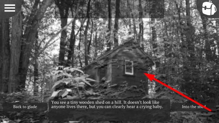 2、在树林场景探索时,发现山坡上有间“tiny wooden shed”,界面底部提示能听到婴儿哭声,进入小屋,进一步探寻诡异哭声背后的秘密。