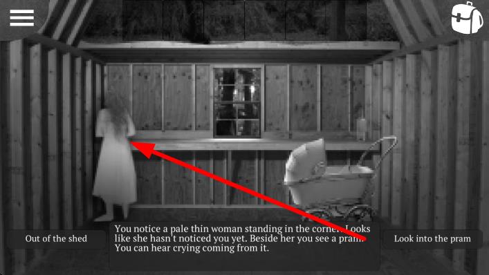 3、进入小屋后有婴儿车传出哭声,依据探索推进需求,可点击对应箭头指向的白衣女人,触发后续剧情,揭开小屋内隐藏的恐怖内容。