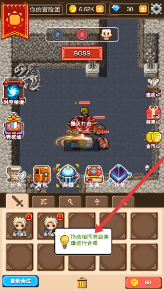 1、进入游戏后,在英雄界面,按照提示购买英雄后,拖动相同等级英雄进行合成,提升英雄的品质。