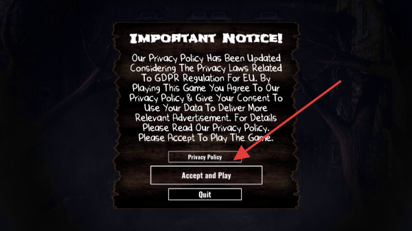 1、游戏启动后,出现界面,需阅读隐私政策更新内容,点击Accept and Play按钮接受政策,方可进入游戏主菜单。